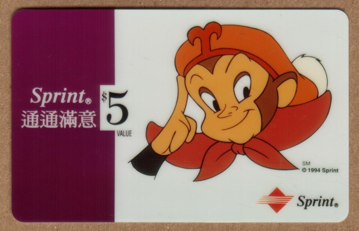 The left side of the card displays a solid purple vertical stripe with the word "Sprint" and Chinese characters beneath it, indicating the connection to Sprint's telecommunications services. The card has a "$5 Value" marked prominently, showing its prepaid value for use. The lower right corner has the Sprint logo and the trademark "SM © 1994 Sprint," confirming the card's association with Sprint and its production year.