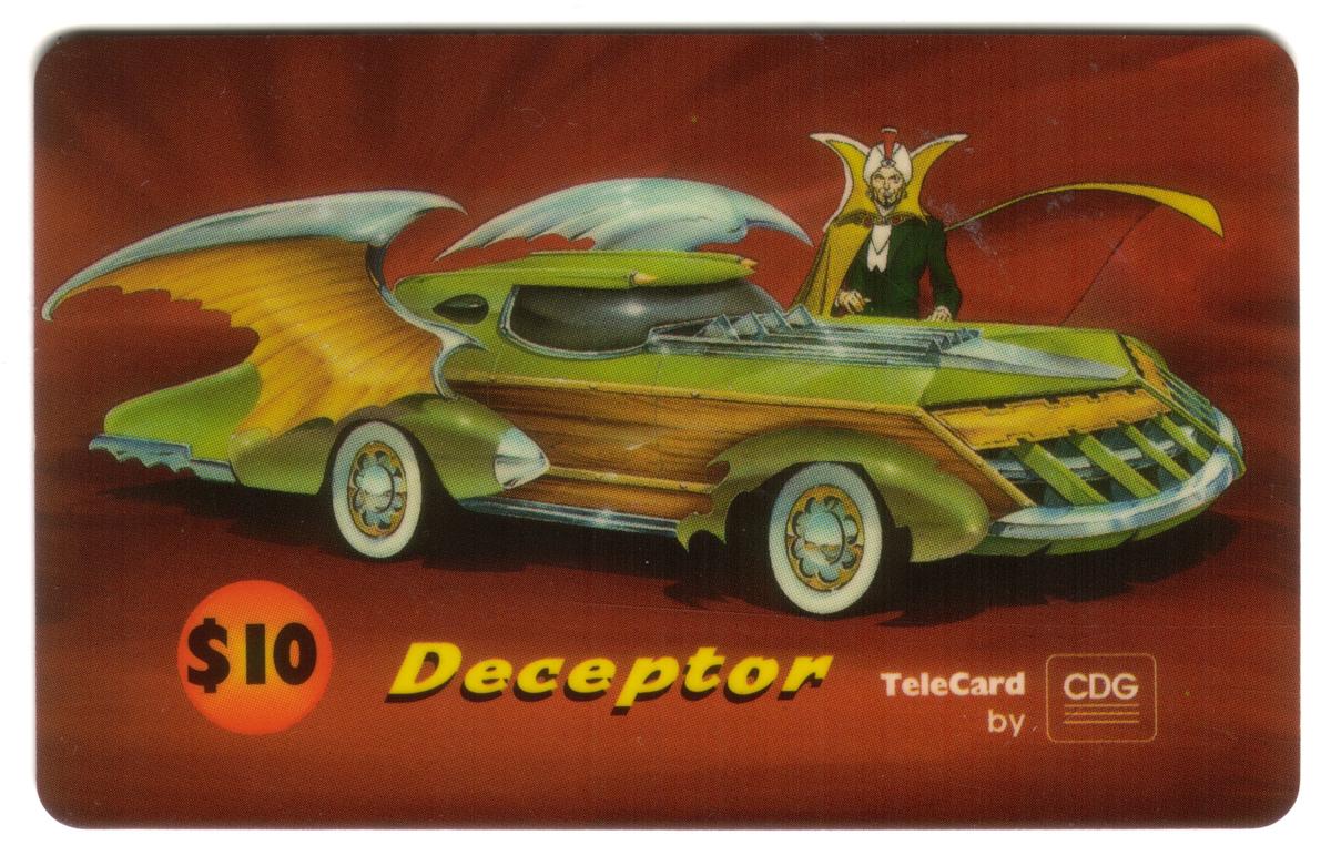 This collectible phone card features artwork by Jack Kirby, a renowned comic book artist, and is associated with the 1994 Ruby-Spears Productions series titled "Warriors of Illusion." The card prominently displays the character Deceptor, depicted in a detailed, colorful fantasy cartoon style typical of Kirby’s dynamic and bold artistic approach. The image captures a powerful, armored figure with striking red and blue tones, showcasing intricate designs on the helmet and armor without any numerical markings.