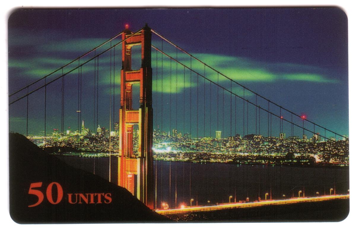 The card displays "50 UNITS" in red text on the lower left corner, indicating the card's value for phone use. The design emphasizes the renowned architectural and touristic significance of the Golden Gate Bridge, one of the most recognized landmarks in the United States.