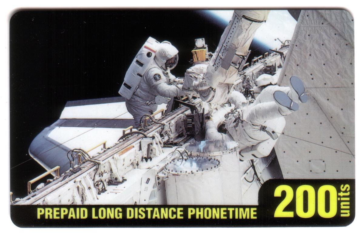 The card prominently displays "PREPAID LONG DISTANCE PHONETIME" in yellow text at the bottom left corner. The value "200 units" is shown in large yellow numbers on the bottom right, indicating the prepaid usage amount for the card. The overall design emphasizes space exploration, aligning with the keywords related to NASA, spaceship, and astronauts in space.