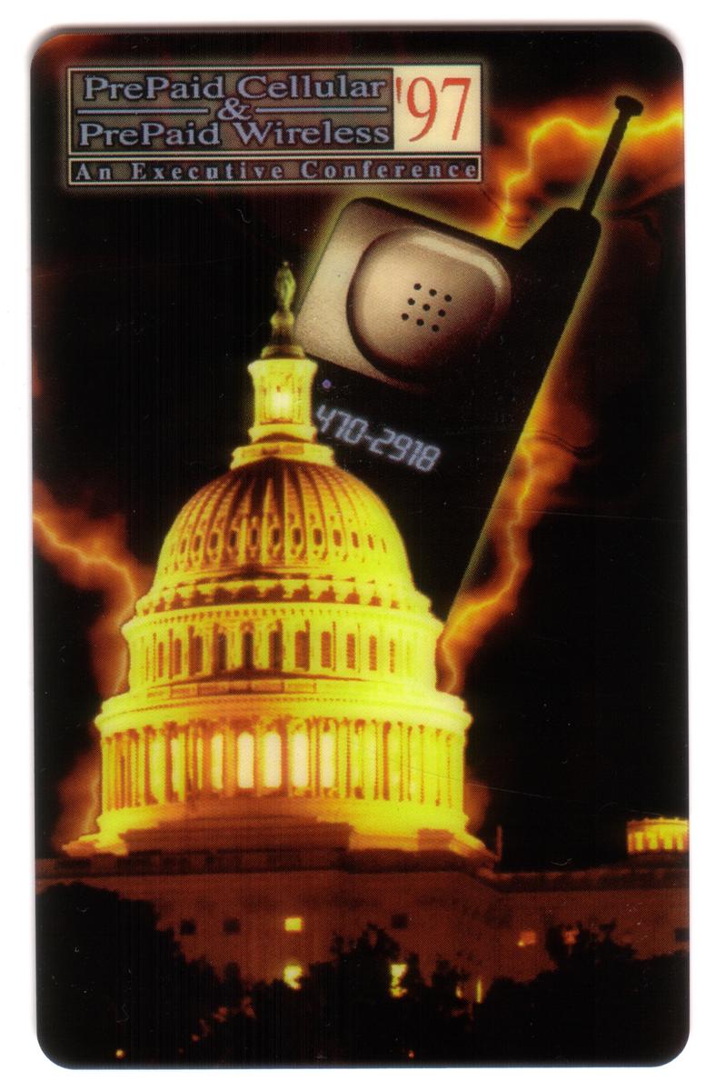 This card was issued as part of a promotional series related to the 1997 Prepaid Cellular & Prepaid Wireless Show, as indicated by the text "Prepaid Cellular & Prepaid Wireless 97 Show Card." The card further references the event’s connection to EastWest Telecom and the AT&T brand. The front of the card includes printed information mentioning an executive conference and exposition held in Washington, D.C., highlighting the role of telecommunications in prepaid services during that period.