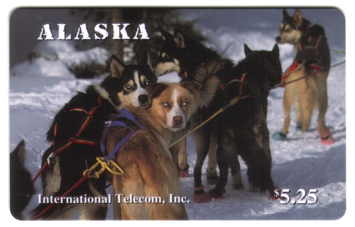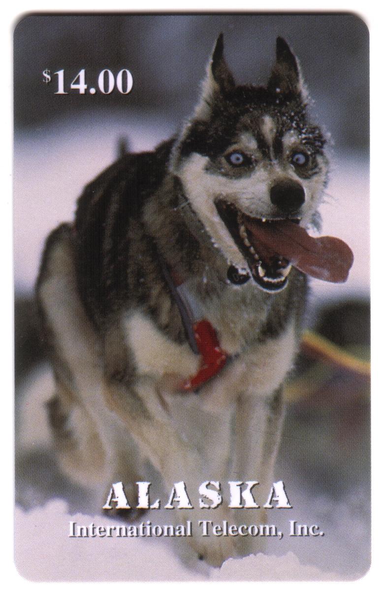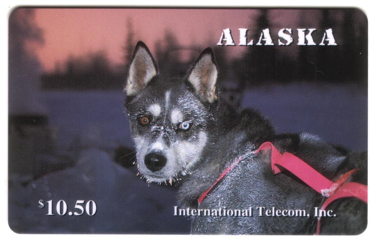 The third card focuses on a close-up of a husky panting, its tongue extended and eyes gleaming blue, set against a snowy backdrop. "ALASKA" is centered near the bottom with "$14.00" at the upper left and International Telecom, Inc. below the title. The final card shows a black and white husky with golden brown eyes and its tongue slightly out, against a dark background. The card text reads "ALASKA $26.25" near the bottom with International Telecom, Inc. beneath it.