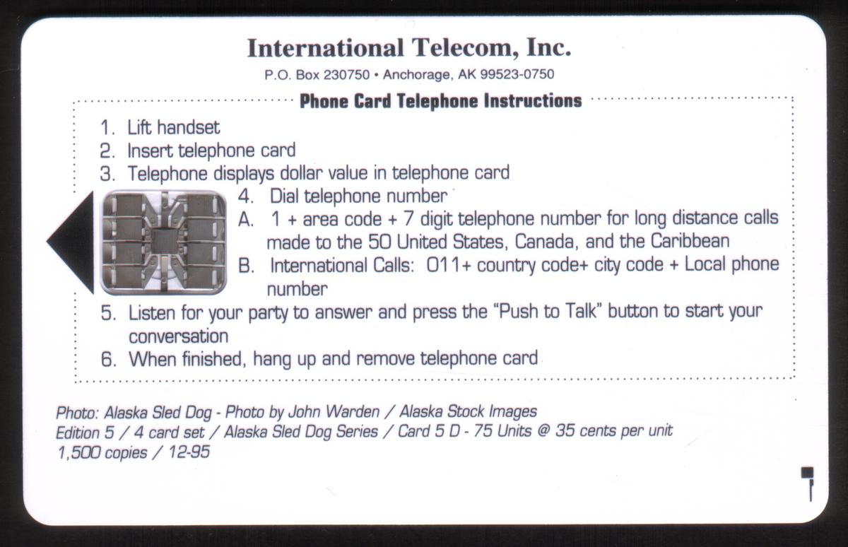 These four collectible chip cards from International Telecom, Inc. feature Alaskan Huskys and are part of the Alaska Sled Dog Series from 1995. Each card displays a vivid photographic image of Alaskan Huskys in snowy environments, highlighting the strength and beauty of these sled dogs, captured by photographers John Warden and Jeff Schultz.