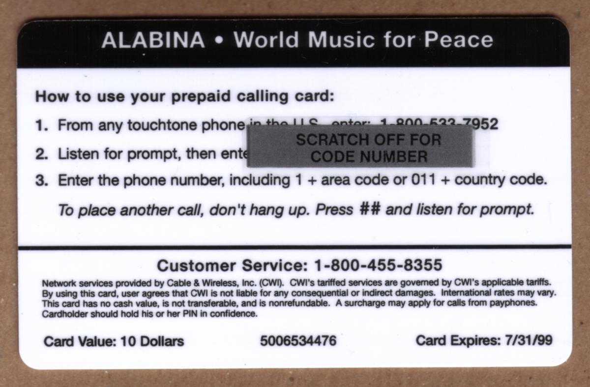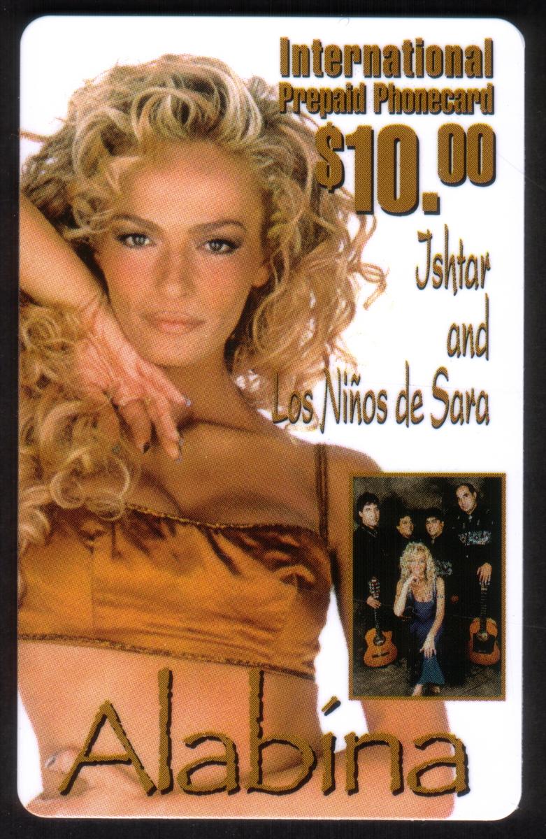 At the bottom of the card, the word “Alabina” appears in large, gold-colored lettering, referencing the band known for blending various musical styles. This $10 phonecard commemorates the collaboration between Ishtar and Los Ninos de Sara under the Alabina name, highlighting their connection to world music and international audiences. The card’s design ties together the individual artist with the band, making it a collectible piece celebrating their musical contributions.
