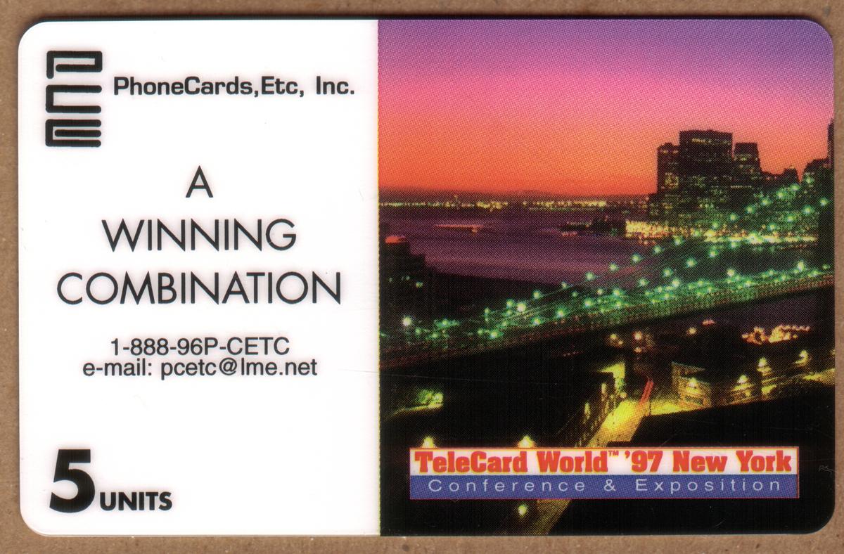 The first card includes branding from PhoneCards, Etc., Inc., along with the title "A WINNING COMBINATION" and the contact email pcetc@lme.net. It is designated with a value of 5 units. The bottom right corner on the image side is labeled "TeleCard World '97 New York Conference & Exposition."