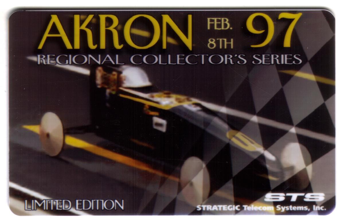 The card includes clear textual elements such as "ATHENA 10u REGIONAL COLLECTOR SERIES: AKRON OHIO 1997" positioned near the top. The words "Strategic Telecom Sys." appear along the bottom, identifying the telecommunications system associated with the card. The overall color scheme is dominated by bright reds and whites on the car, set against a track surface and a blurred background that suggests high velocity.