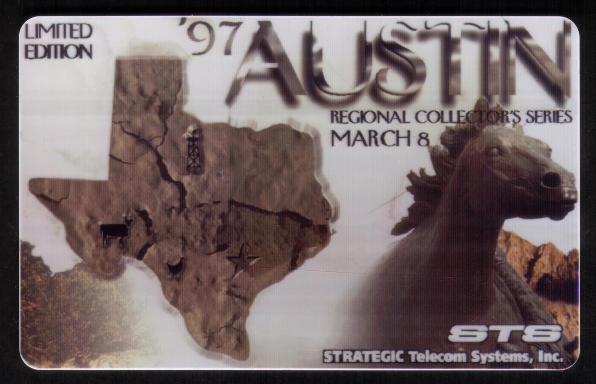 This collectible phone card is from the Athena 20u Regional Collector Series and highlights Austin, Texas, dated 1997. The card features vibrant imagery that includes elements representing Texas culture and landscape. Prominently displayed are a longhorn steer and horses, symbolizing the state's ranching tradition. The Lone Star emblem, a well-known symbol of Texas, appears clearly on the card.