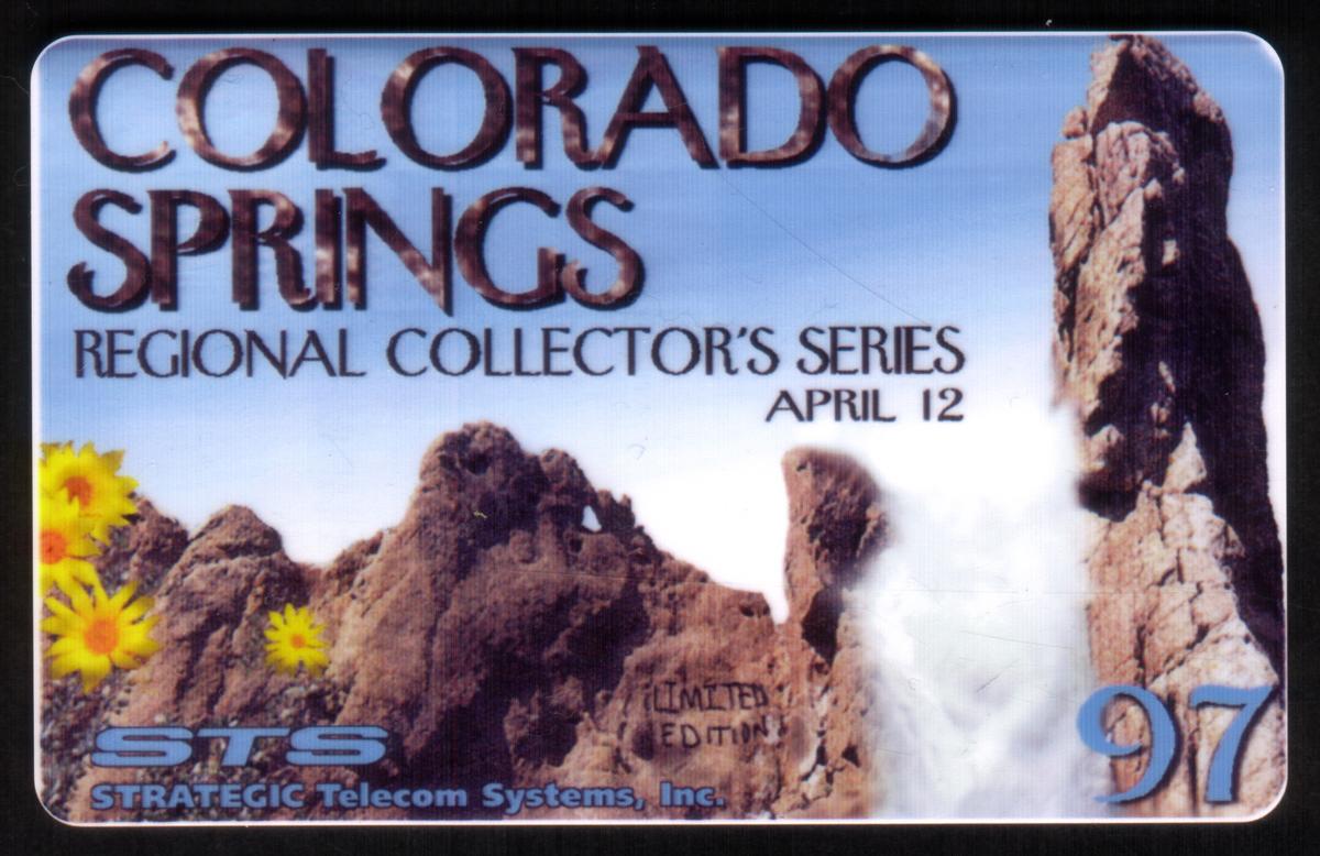 This collectible phone card features a scenic photograph of Colorado Springs, Colorado, showcasing a sprawling mountainous landscape under a clear sky. The image captures rugged mountain peaks with varying shades of green and brown, emphasizing the natural beauty of the region. The card is part of the Athena 20u Regional Collector Series from 1997, produced by Strategic Telecom Systems.