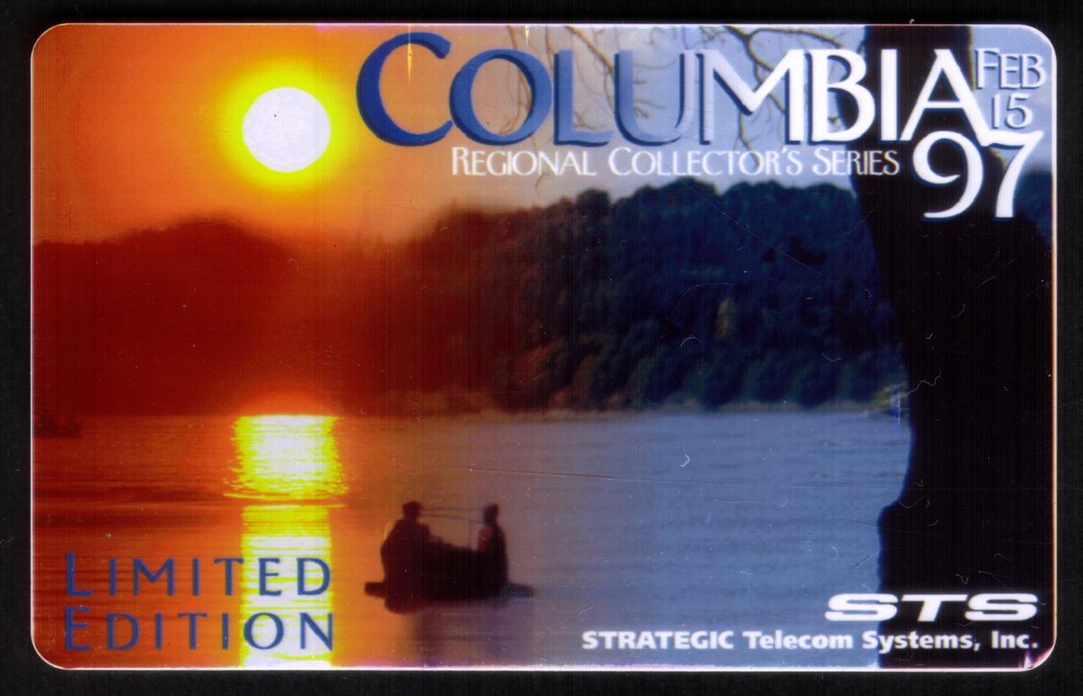 This collectible phone card features a colored photograph of a small white motorboat with blue trim on the water. The boat is identified as the Athena 20U. The card includes the text "Regional Collector Series: Columbia (Missouri Or SC)" and "Feb. 1997" printed on it, indicating its connection to a specific regional event or release date. The bottom left corner of the card presents the company name "Strategic Telecom Sys."