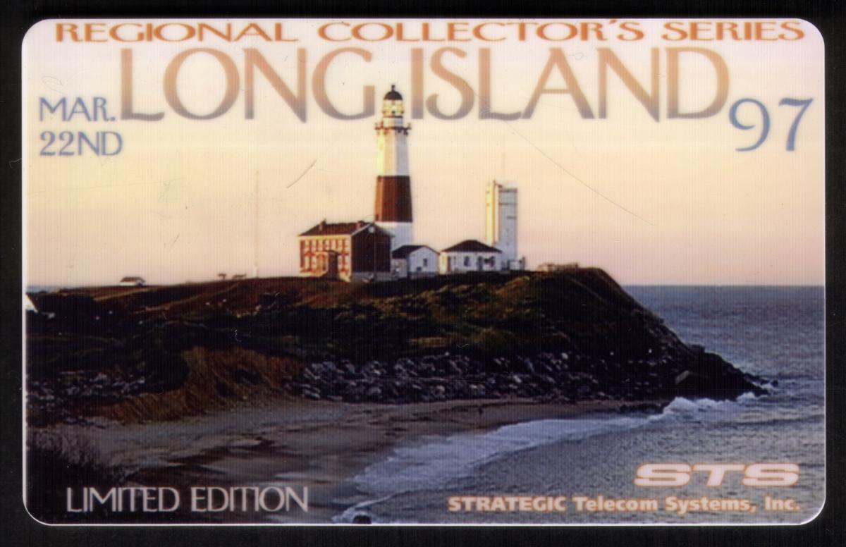 The card prominently displays the text "Montauk Point Lighthouse" and "Long Island, New York" along with a denomination indicator ā20uā. The design includes the logo of Strategic Telecom Sys, the issuer of the card, located in one corner, reinforcing its collectible nature. The overall presentation emphasizes the lighthouse as a regional icon within this phone card series.