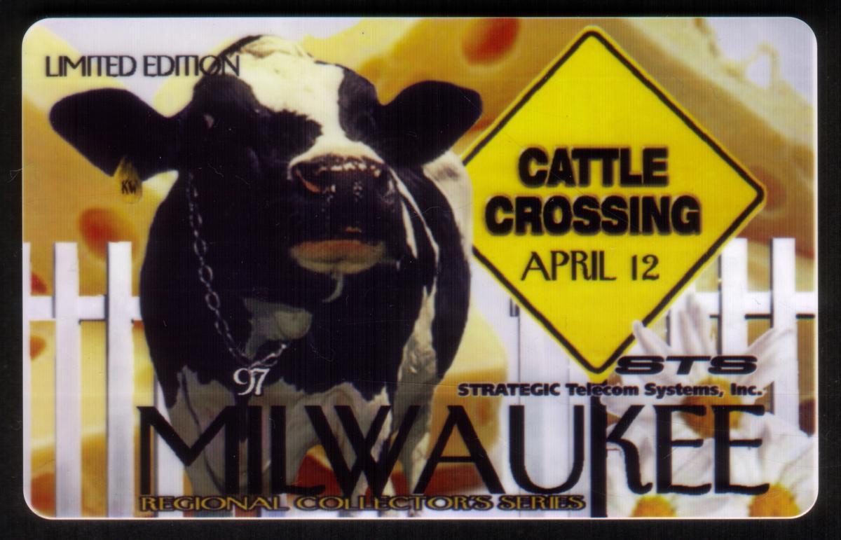 This collectible phone card is from the Athena 20u Regional Collector Series, specifically featuring Milwaukee, Wisconsin, from 1997. The card prominently displays a detailed illustration of a cow in the foreground, representing cattle. The cow is depicted with realistic coloring and shading, positioned standing and facing slightly to the left. The background shows a pastoral scene, adding context to the agricultural theme represented by the cow.