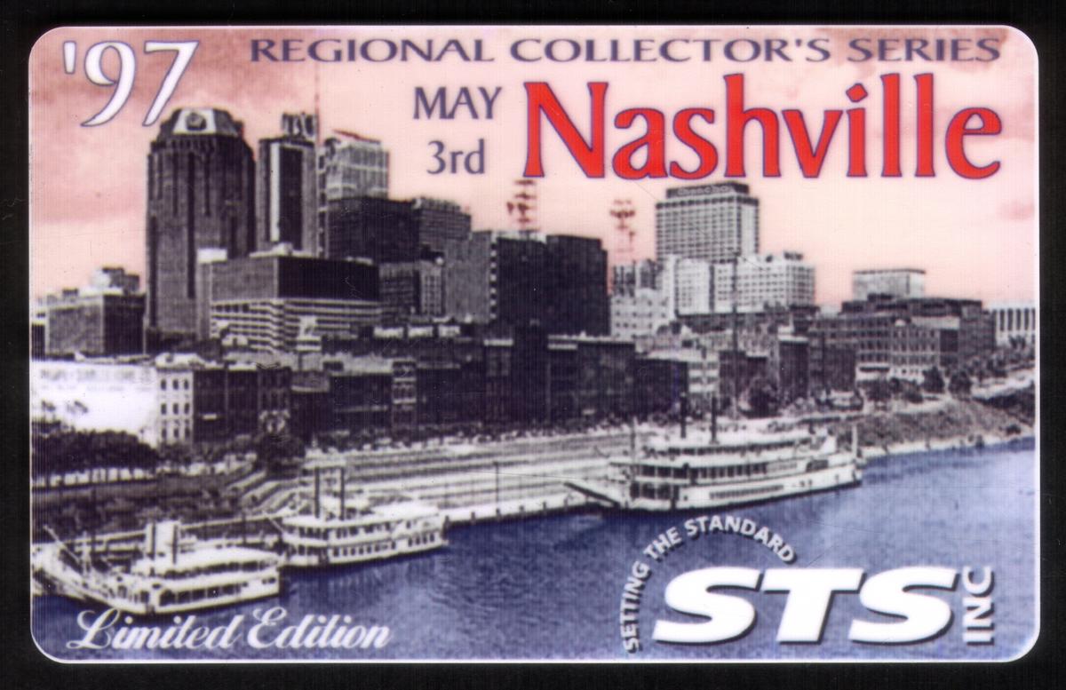 The card was produced by Strategic Telecom Systems and features the city’s name, "NASHVILLE TENNESSEE," clearly indicated. The design integrates both natural and man-made elements, with the boats positioned on water in front of the high-rise buildings. This card reflects a regional theme focusing on Nashville’s distinct cityscape during the late 1990s.