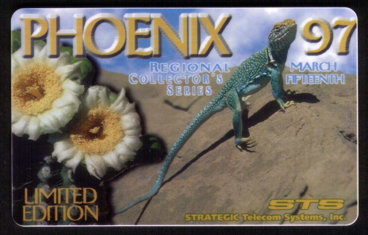 Overall, the design merges Southwestern desert imagery with an emphasis on local wildlife and flora. The lizard and saguaro cactus flowers represent Arizona's distinct desert environment, aligning with the card series’ focus on the Phoenix region from 1997. The card balances vivid natural imagery with clear branding and collector information.