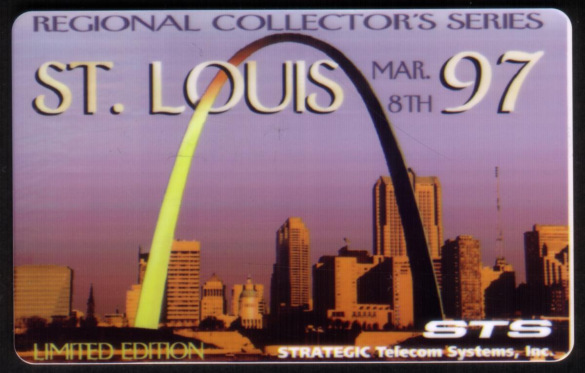 The card includes clear text indicating “Strategic Telecom Sys.” and “Athena 20u Regional Collector Series: St. Louis Missouri 1997,” establishing its origin and place within the regional series. The design emphasizes the well-known cityscape of St. Louis, with the Gateway Arch as the centerpiece, symbolizing the city’s architectural and cultural heritage.