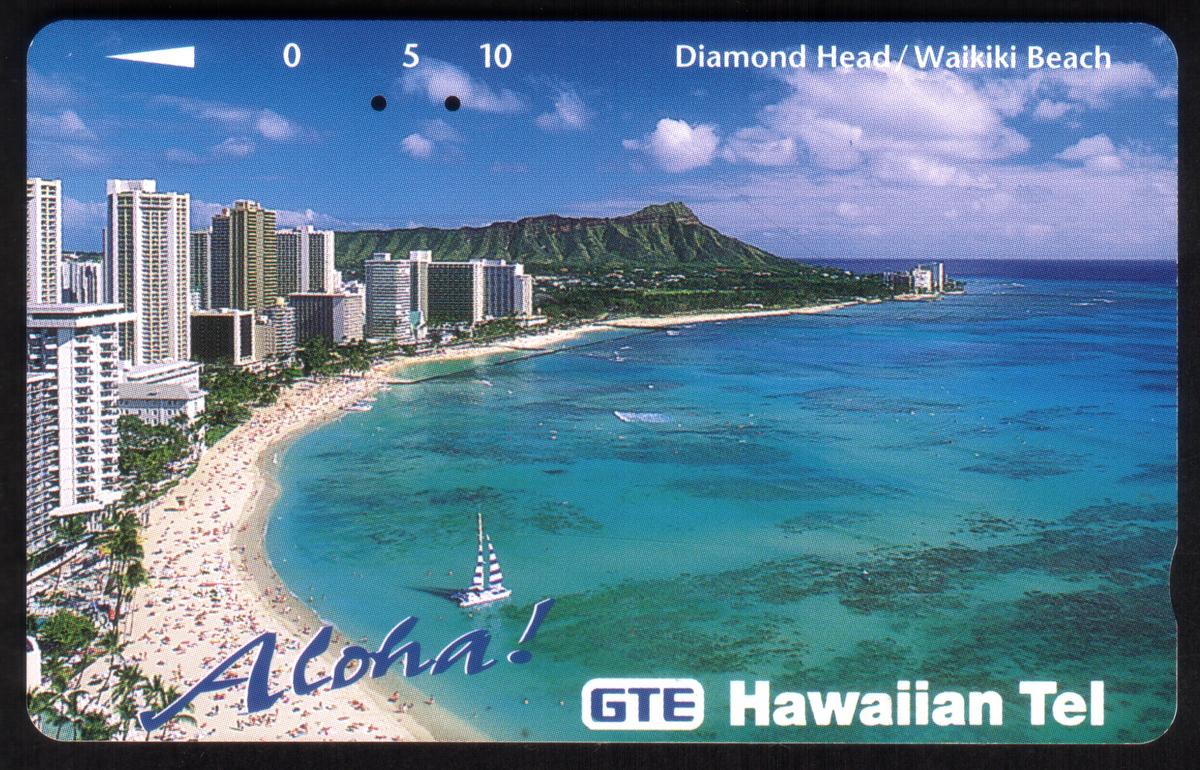 This collectible phone card features a vibrant photographic image showcasing Waikiki Beach and Diamond Head on the Hawaiian coast. The scene depicts a sunny day with clear blue skies, palm trees, and expansive sandy beaches along the shoreline. The iconic Diamond Head volcanic crater is visible in the background, highlighting one of Hawaii’s well-known landmarks. The overall image embodies the scenic beauty and tropical atmosphere of the Hawaiian Islands.