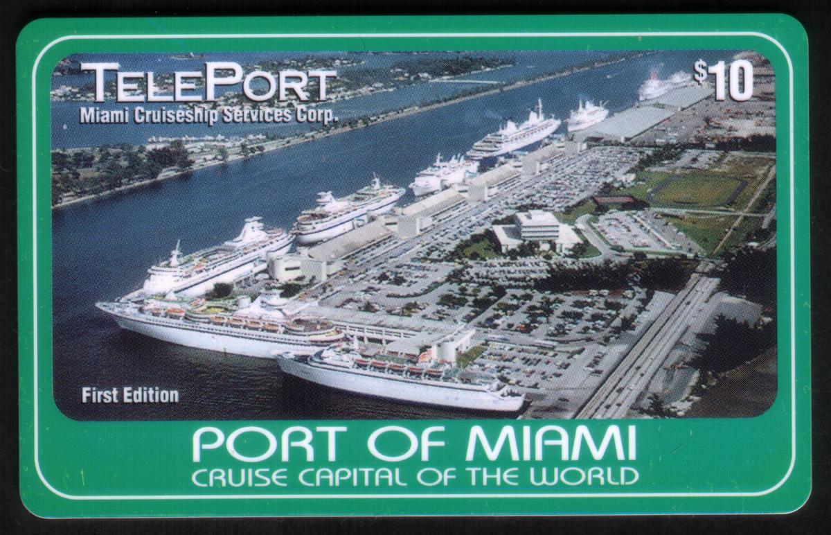 This collectible card features a detailed design focused on transportation, specifically cruise ships, associated with Miami CruiseShip Services Corp. The card has a green background and prominently displays the text "Miami Cruiseship Services Corp" along with a denomination value of $10. The card also includes the name "Port of Miami (TelePort Cruiseship Services)," indicating its connection to the Port of Miami, a well-known cruise ship terminal.