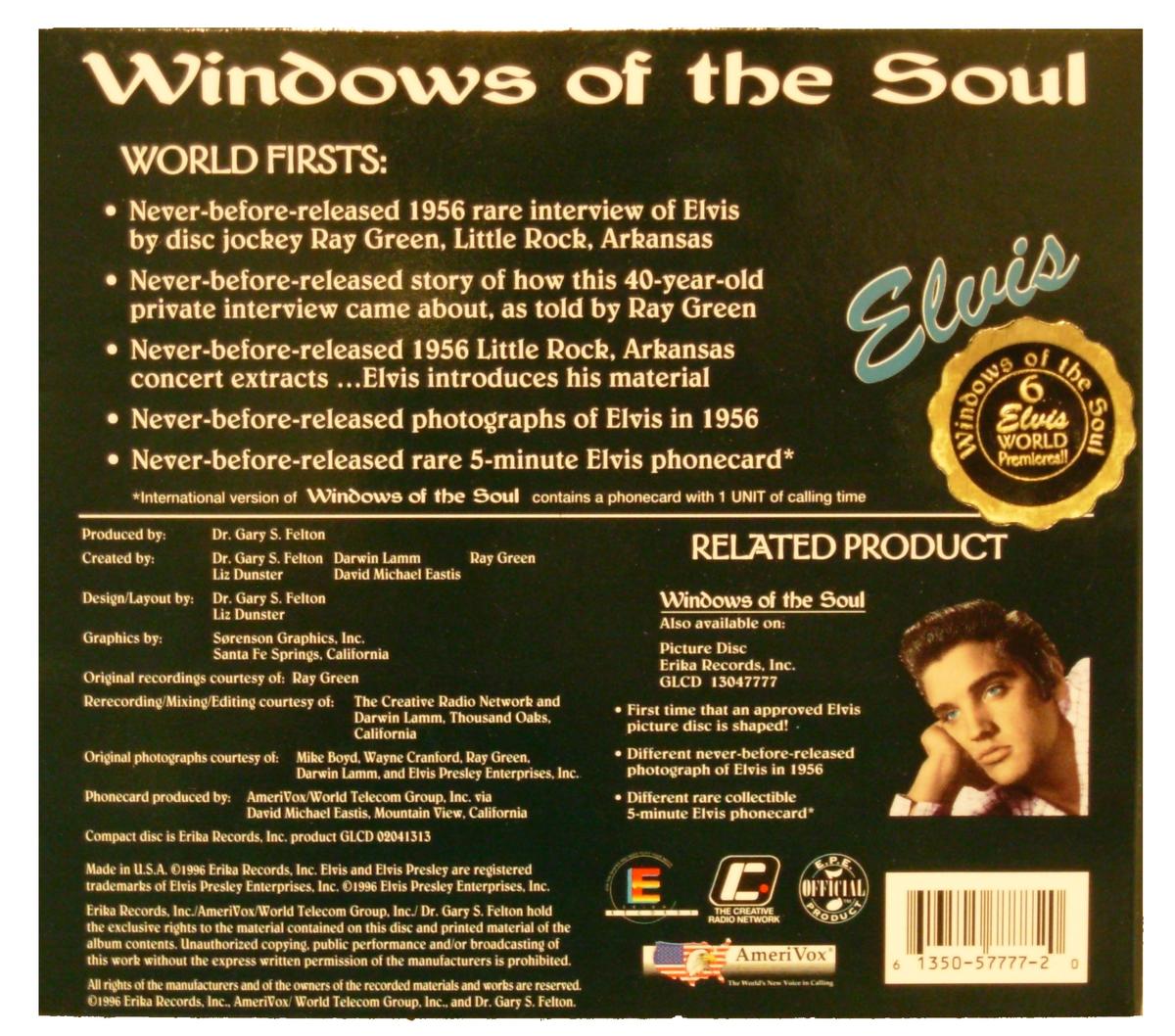 | Elvis 'Windows Of The Soul' Music CD & 5m Phone Card. NEW & Sealed |