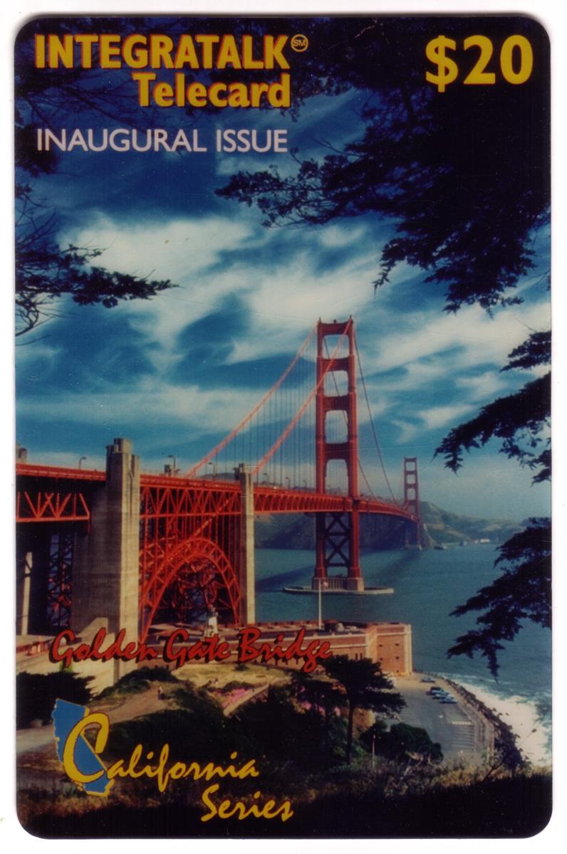 Text on the card includes "Integrity Telecom," "IntegraTalk," and "$20", reinforcing the card’s value and issuing company. The overall presentation is clean and professional, catering to collectors interested in travel themes or telecommunications memorabilia related to California landmarks.