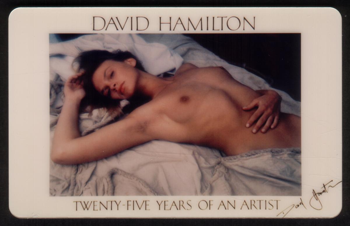 This collectible phone card features an artistic photographic image of a nude woman laying in bed. The photograph is by David Hamilton, known for his soft-focus, intimate style, and is dated July 1994. Text on the card identifies it as "David Hamilton: Twenty-Five Years. Nude Woman Photo #1 SPECIMEN 7/94." The image captures a serene and delicate moment, emphasizing natural light and subtle shading, reflective of Hamilton’s signature aesthetic.