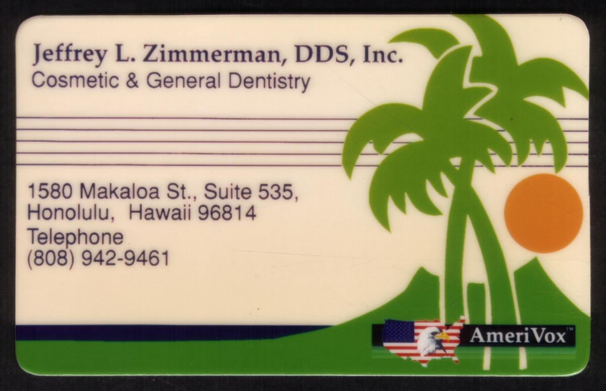 This is a collectible medical promotional card for Jeffrey L. Zimmerman, DDS, Inc., featuring Cosmetic & General Dentistry services. The card displays contact information for the dental office located at 1580 Makaloa St., Suite 535, Honolulu, Hawaii 96814. The telephone number provided is (808) 942-9461.