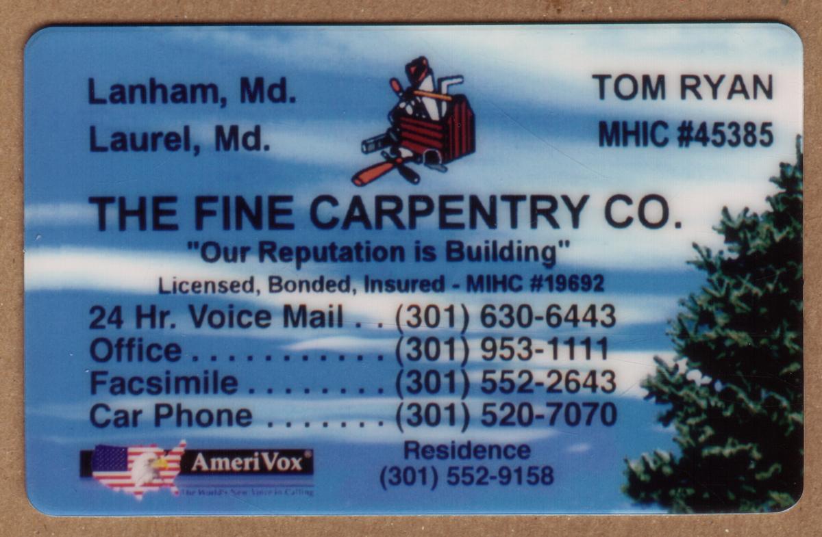 This collectible phone card features branding from The Fine Carpentry Company and prominently displays the names Lanham, MD and Laurel, MD, indicating locations associated with the company. The phrase "Our Reputation Is Building" is printed on the card, emphasizing a commitment to quality craftsmanship. The card also includes the name Tom Ryan Laurel Maryland.