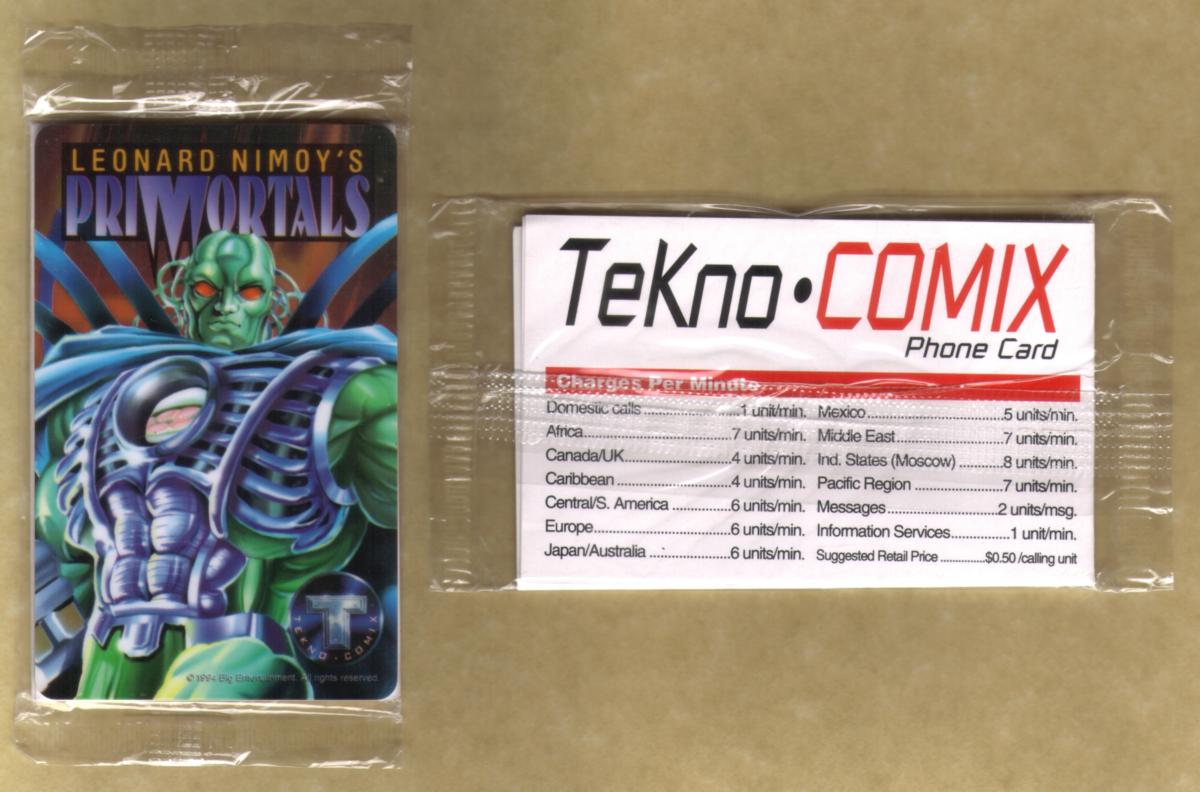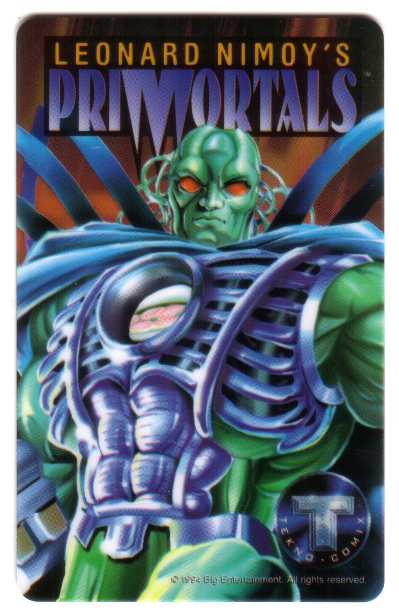 This card is related to the techno-comics and animation genre, prominently featuring comic strip art and characters from Leonard Nimoy's Primortals within the Teknoverse universe. It is a sealed collectible associated with the themes of super heroes and techno-comics. The copyright notice at the bottom credits Big Entertainment from 1994.