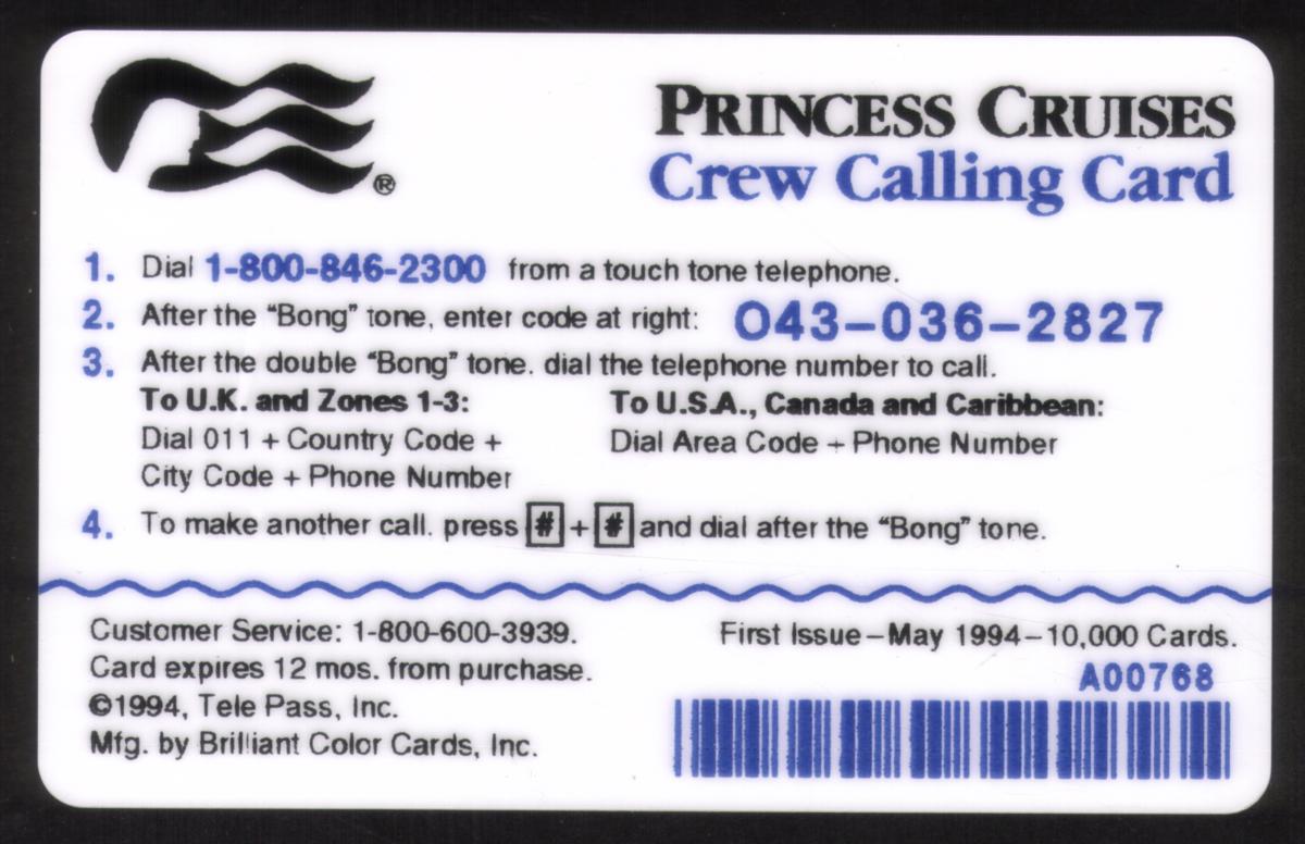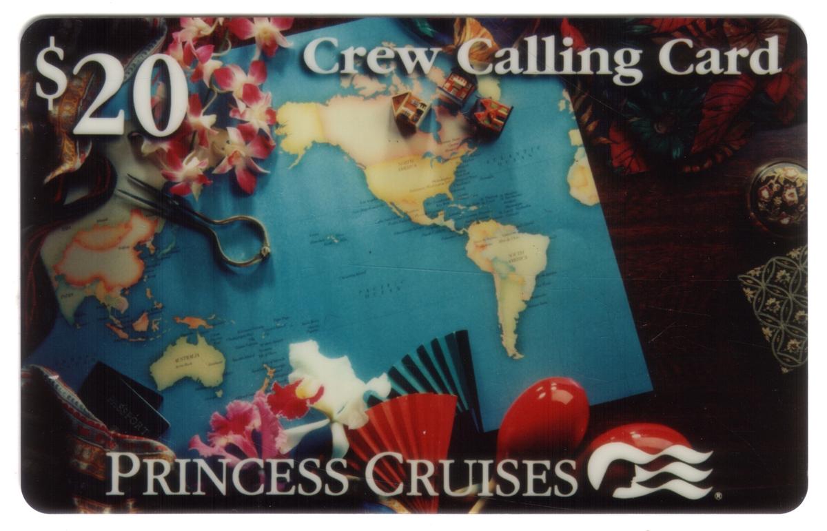 Overall, the card combines floral imagery with navigational and cultural objects to represent Princess Cruises and its crew calling service, marking it as a collectible item for enthusiasts of cruise line paraphernalia and phone cards.