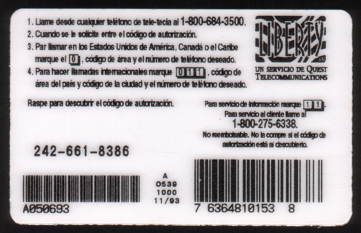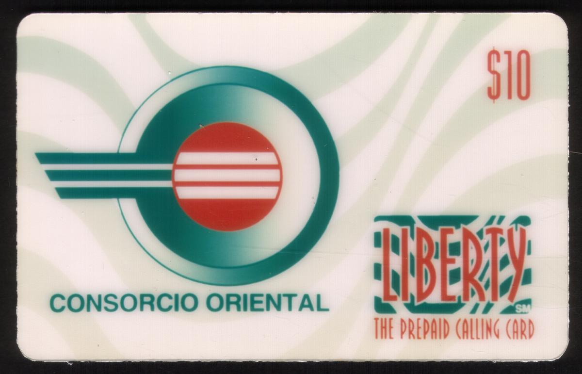 Vintage Latin American prepaid calling card featuring Consorcio Oriental logo, Liberty branding, $10 value, vibrant colors, and bilingual instructions. |