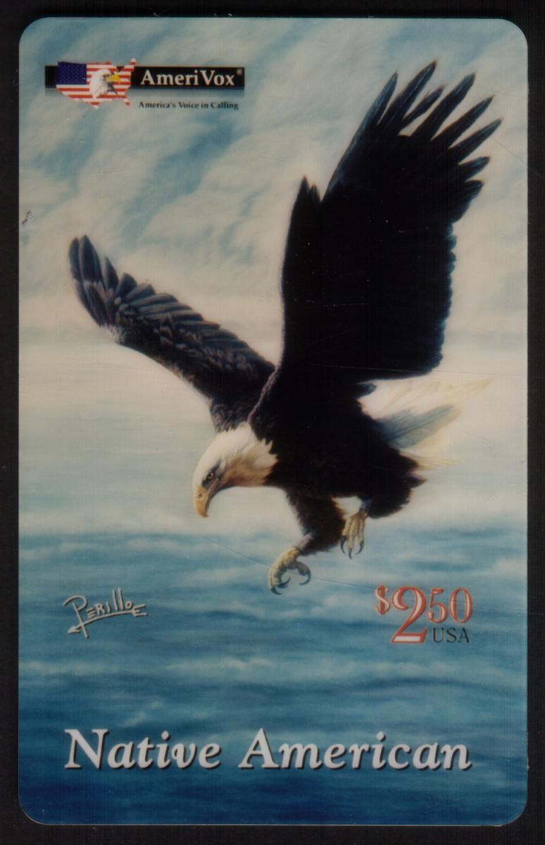 The top left corner contains the AmeriVox logo, including a small American flag and the tagline "America's Voice is Calling." The bottom right corner shows the monetary value "$2.50" along with "USA," indicating the card's denomination and country of origin. The card’s title "Native American" appears at the bottom center in a white serif font, linking the design to themes of American history and wildlife.