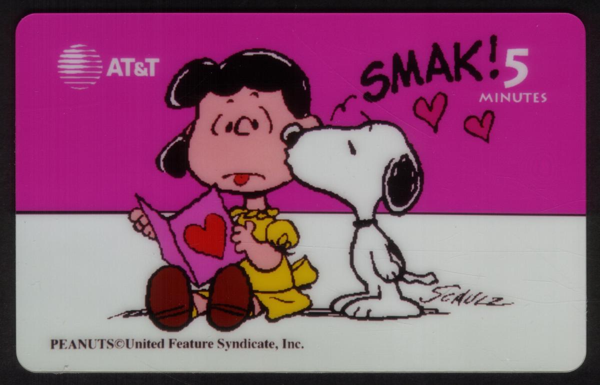 This collectible AT&T phone card features Snoopy from the Peanuts comic strip kissing Lucy on the cheek. Lucy is seated, holding a pink book with a large red heart on the cover, while Snoopy stands beside her, giving her a kiss. The background is divided into two sections: the upper half is pink, and the lower half is white. Above Snoopy's head, the word "SMAK!" appears with two red hearts, emphasizing the affectionate moment.