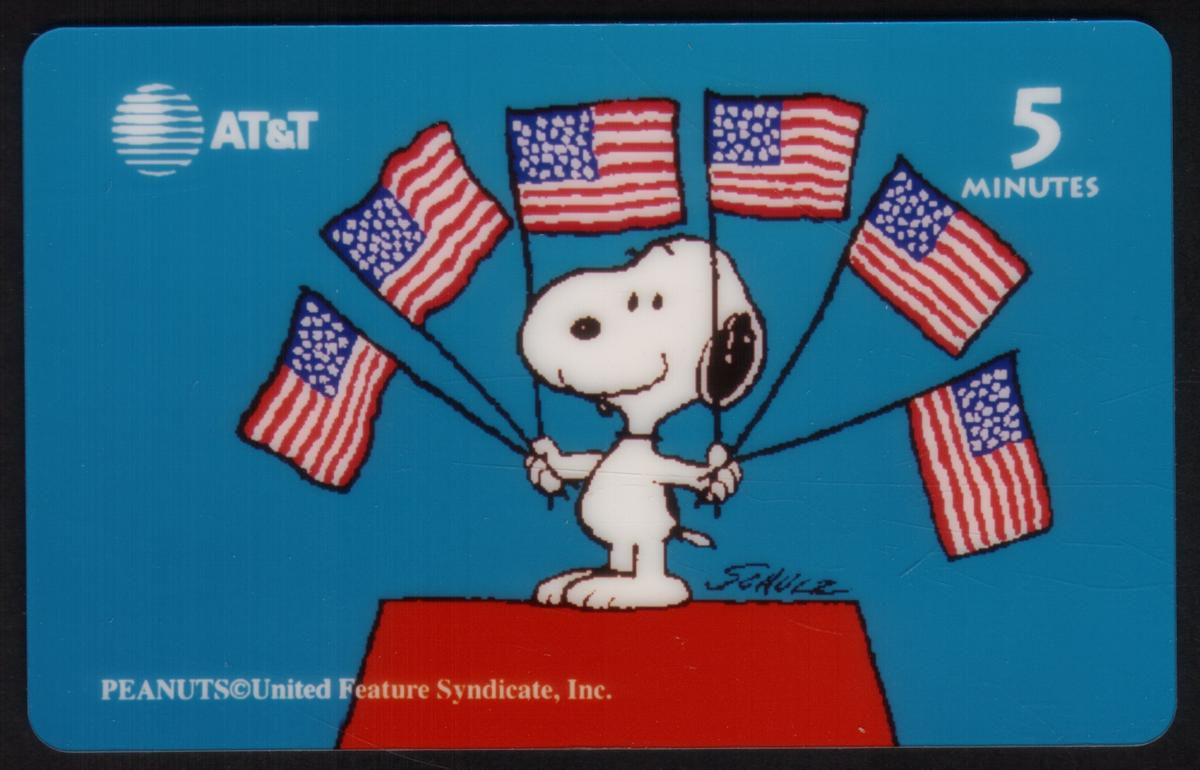 This is a collectible phone card, bearing clear connections to animation, cartoons, comics, and the celebrated American cultural symbols of the US flag. It reflects the collaboration between Charles Schulz’s beloved characters and American patriotic imagery, making it a distinctive piece for collectors interested in animation memorabilia, patriotic themes, or phone card collections.