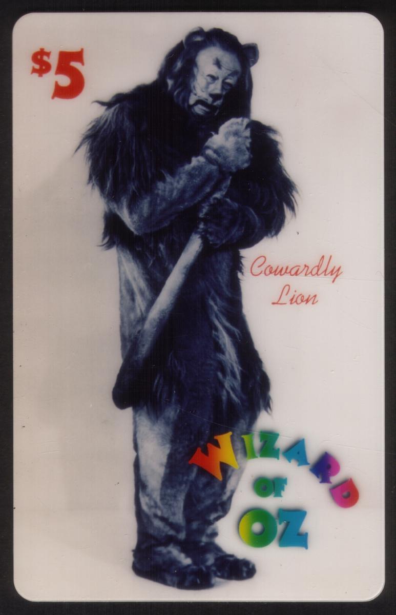 The card is part of a series produced by TeleTrading Cards Inc., focusing on iconic movie classics and fantasy films. The design highlights both the lion and the movie title, "The Wizard of Oz," emphasizing the connection to this celebrated film. The denomination "$5" is prominently displayed in red on the lower part of the card.
