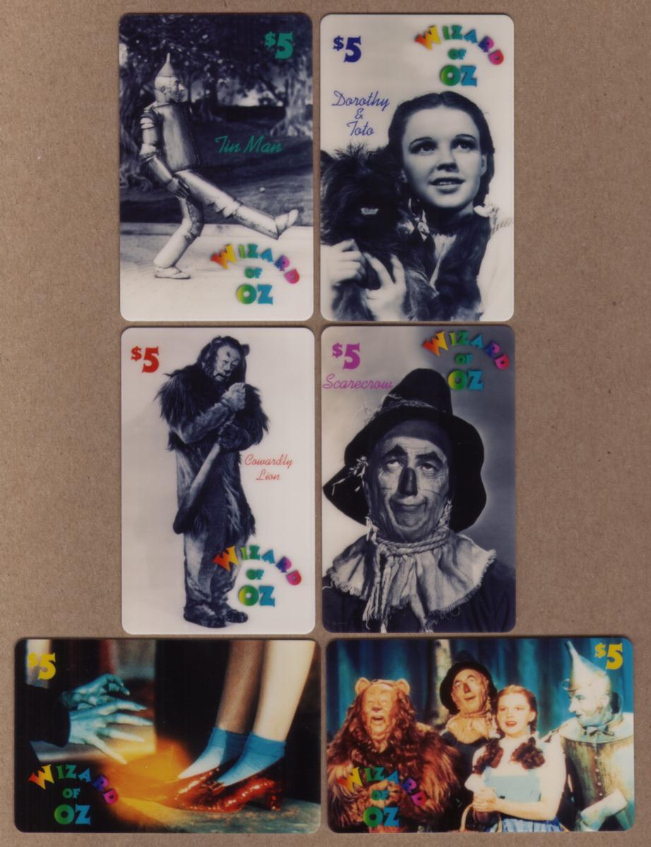 Collectible Wizard of Oz phone cards featuring Dorothy, Toto, Tin Man, Cowardly Lion, Scarecrow, and ruby slippers, capturing iconic characters and moments. |