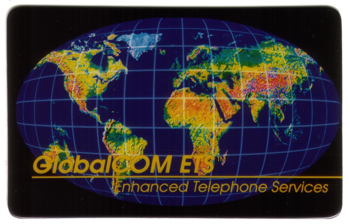Centered near the bottom of the card, the text "GlobalCOM ETS™" appears in bold yellow letters, with "Enhanced Telephone Services" written below it in a smaller yellow font. The combination of the world map with the GlobalCOM ETS branding emphasizes the card's association with international or global telecommunications services.