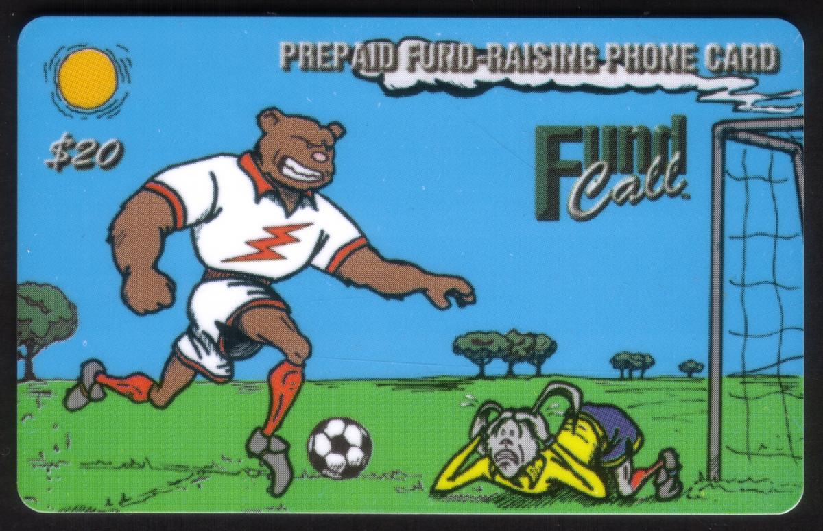 This set contains nine prepaid FundCall phone cards, each with a $20 value, featuring artistic cartoon depictions of athletes in various sports. The first card illustrates a soccer scene on a bright blue sky background, with a bear-like player in a white uniform about to kick a ball, while a rabbit-like goalkeeper lies on the grass near a goalpost. The text "PREPAID FUND-RAISING PHONE CARD" and "FundCall" appear prominently.