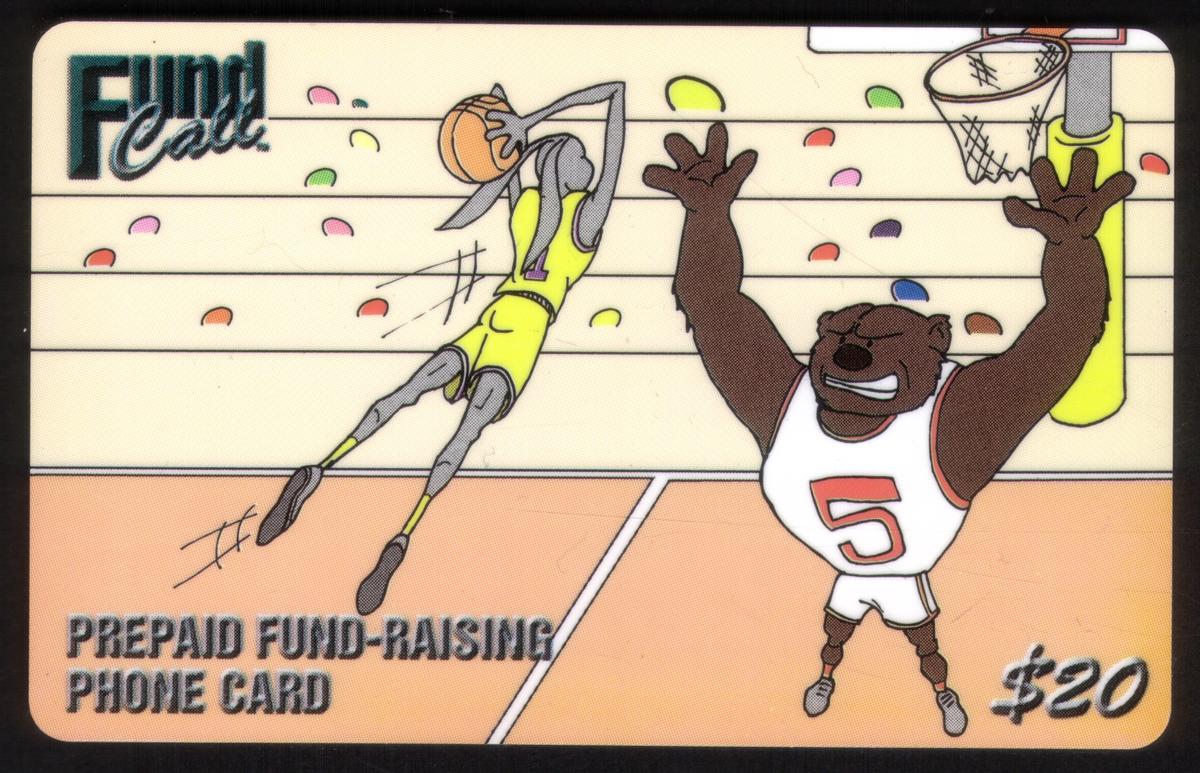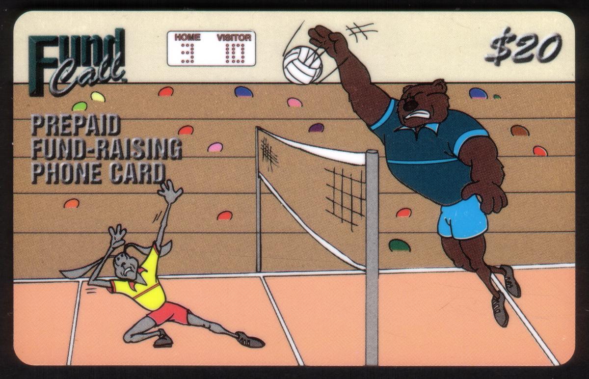 All cards carry the "FundCall" logo and indicate their prepaid fund-raising purpose. The illustrations highlight dynamic moments in sports, blending animal characters with colorful, playful artistry.