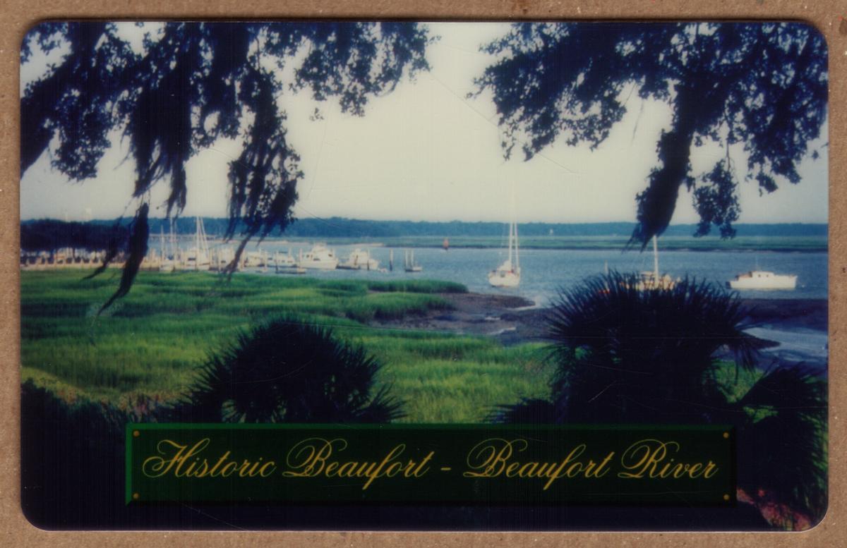 This card combines themes of sightseeing, travel, American history, and transportation, highlighting Beaufort’s rich historical and maritime heritage. The overall design captures the charm of this South Carolina town, known for its preserved historical sights and serene river views.