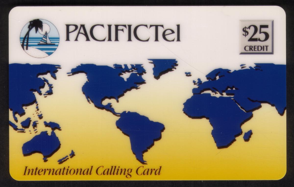 This phone card is designed for international calling use and highlights PacificTel as the service provider. The artistic depiction of the world map underscores its functionality for global communication.