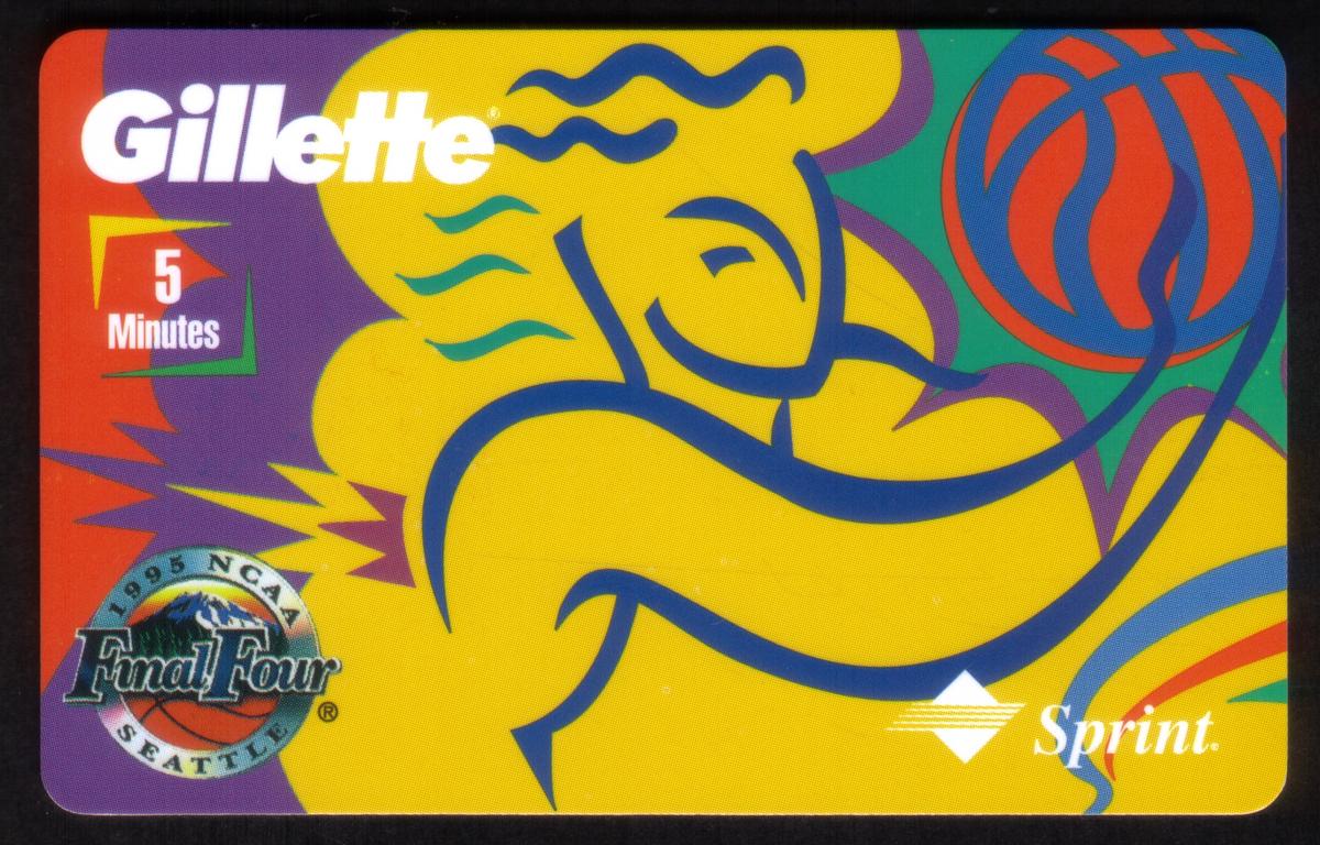 This phone card combines sports imagery related to the National Collegiate Athletic Association (NCAA) basketball tournament with corporate branding from Gillette and Sprint. The design highlights the 1995 NCAA Final Four basketball event held in Seattle, making it a commemorative item for fans and collectors interested in basketball and NCAA promotions.
