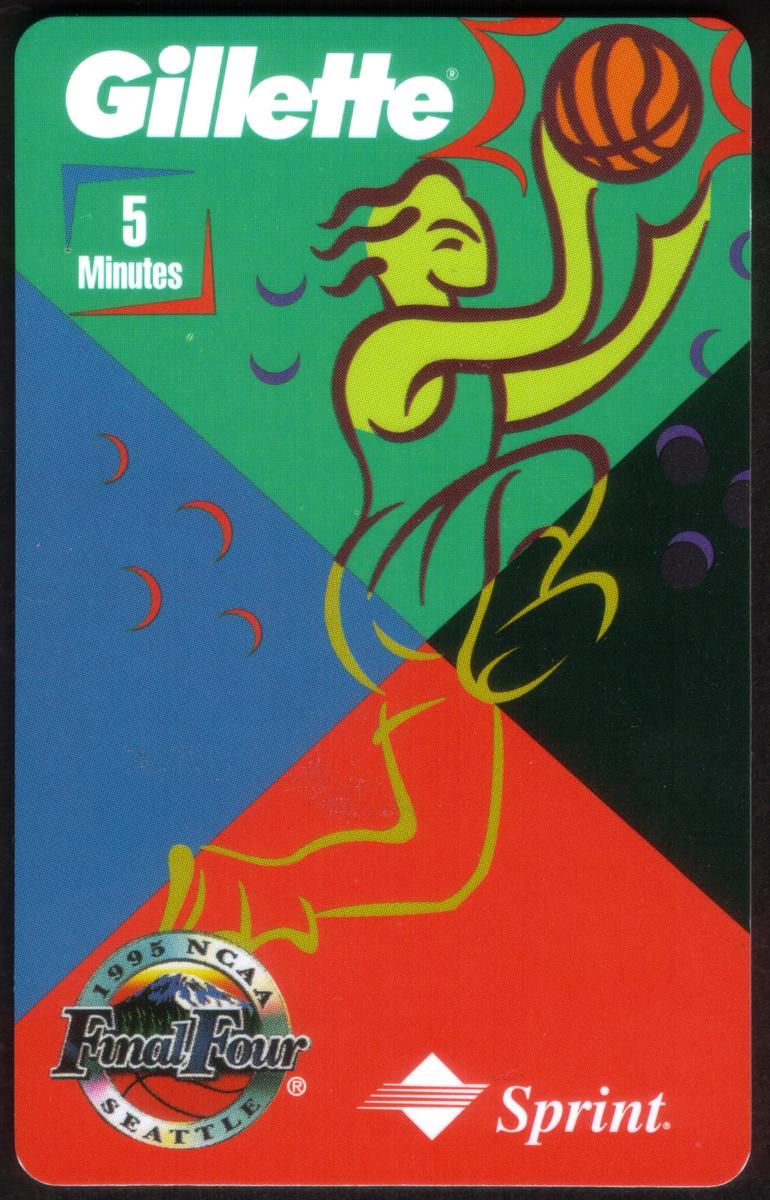 This card is part of a promotional series connected to the National Collegiate Athletic Association (NCAA) basketball, specifically celebrating the 1995 NCAA Final Four event held in Seattle. The overall design incorporates bold colors, NCAA and basketball-related trademarks, and sponsor logos, emphasizing the connection between Gillette, Sprint, and the NCAA basketball tournament.