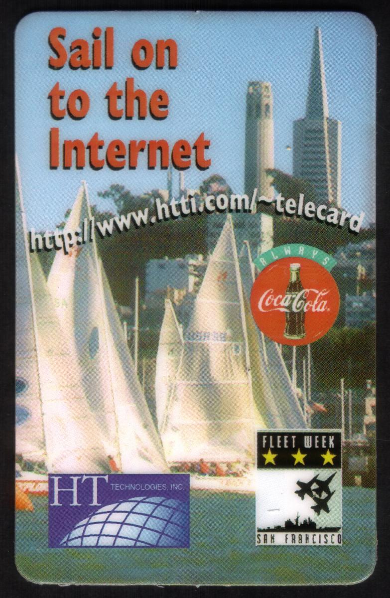 Over the image, a URL is printed: "http://www.httpi.com/~telecard," indicating an internet-related theme. To the right of the center is the Coca-Cola logo, designed with the classic red circle and bottle, accompanied by the phrase "always Coca-Cola" in green lettering encircling the logo. Below the Coca-Cola logo is the Fleet Week emblem featuring three gold stars and an aircraft silhouette above the words "Fleet Week San Francisco."