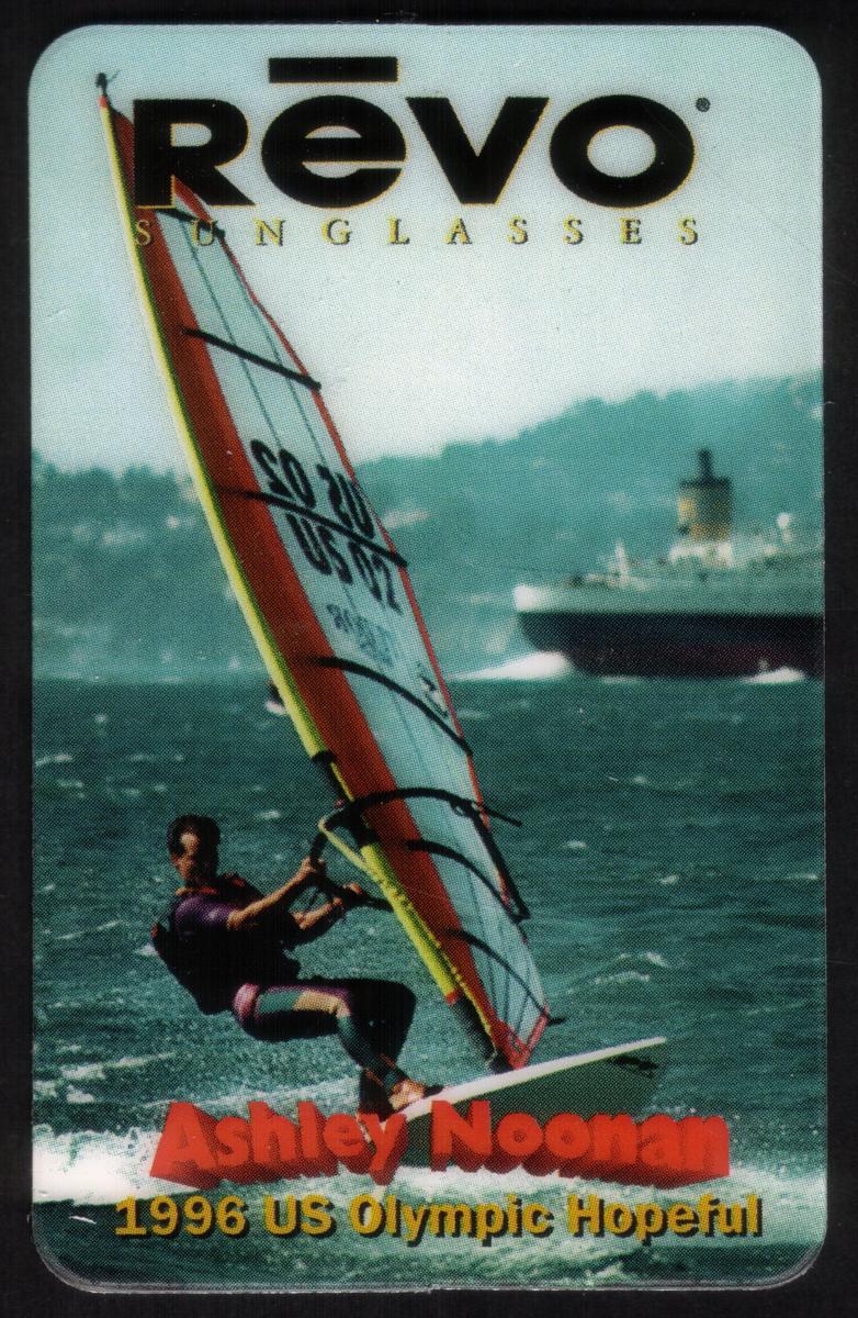 At the top of the card is the "Revo Sunglasses" logo in black and gold lettering. Below the image, the text in red and yellow reads "Ashley Noonan" and "1996 US Olympic Hopeful," indicating her status as a competitor aiming for the Atlanta Olympic Games.