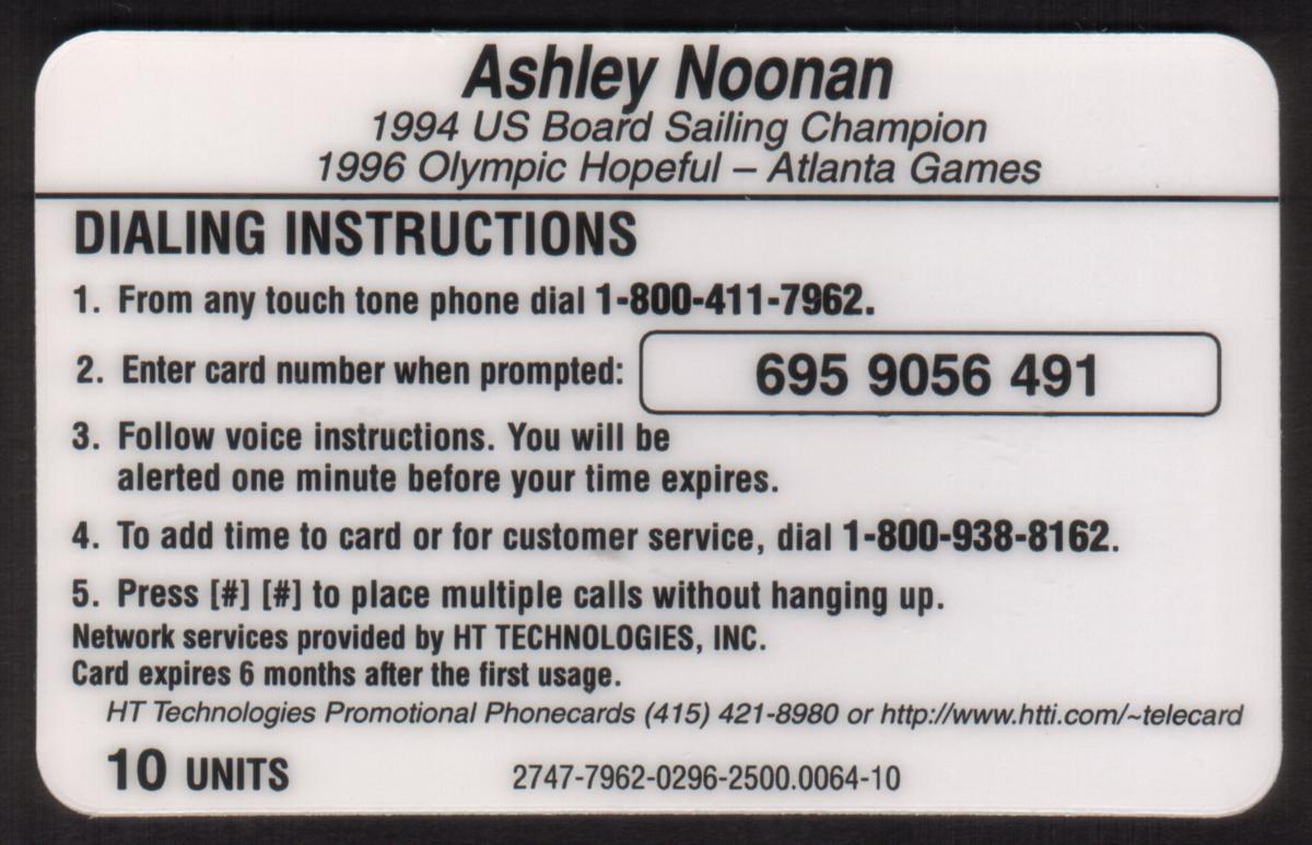 This collectible phone card features an image of windsurfer Ashley Noonan actively sailing on the ocean, with a large transport vessel visible in the background. The windsurfer is leaning back while controlling a brightly colored sail marked with "USA" and other identification numbers. The sail has red, yellow, and white sections, and Ashley Noonan is dressed in a dark wetsuit.