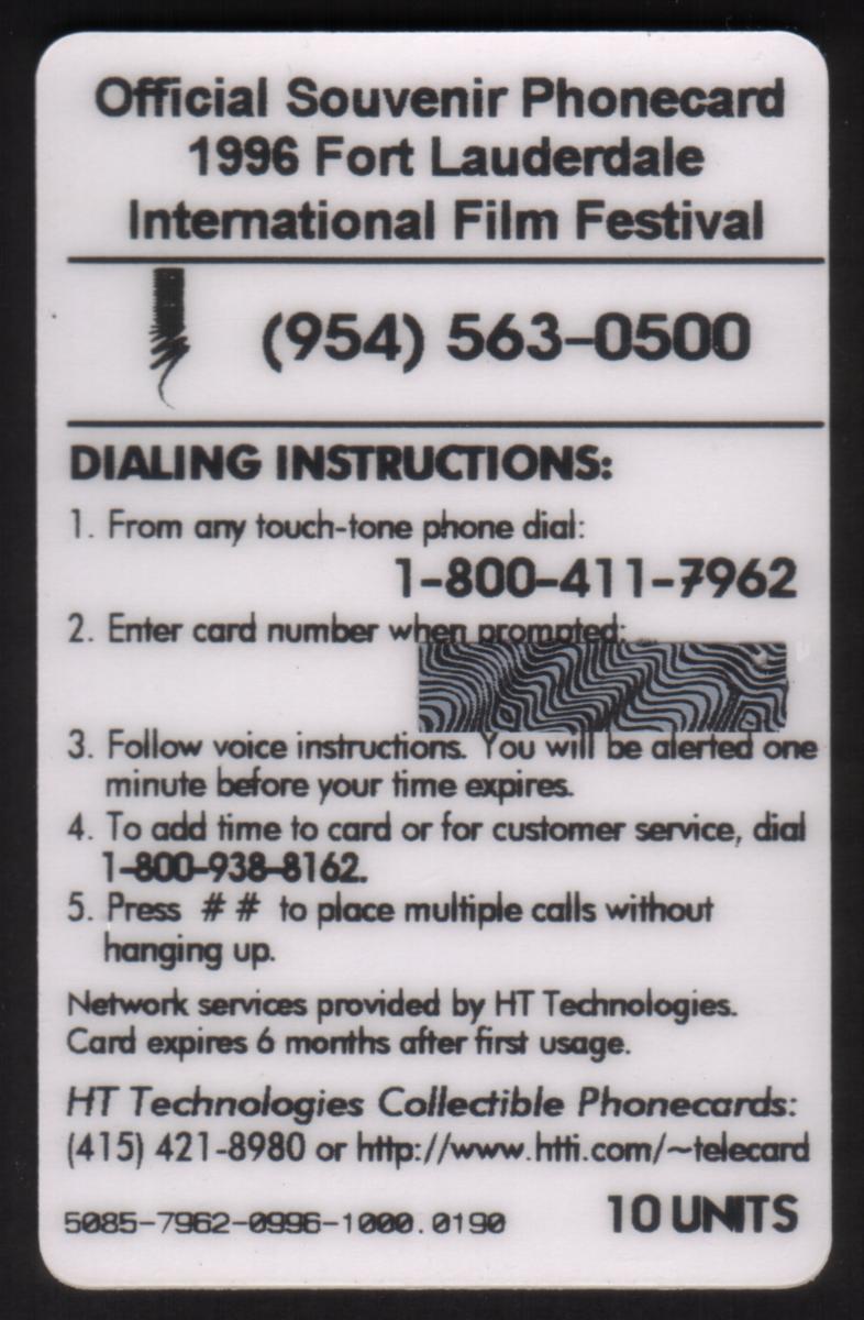 Film festival themed Fort Lauderdale International Film Festival phone card featuring beach scenes, filmstrip design, sponsor logos, and event details. |