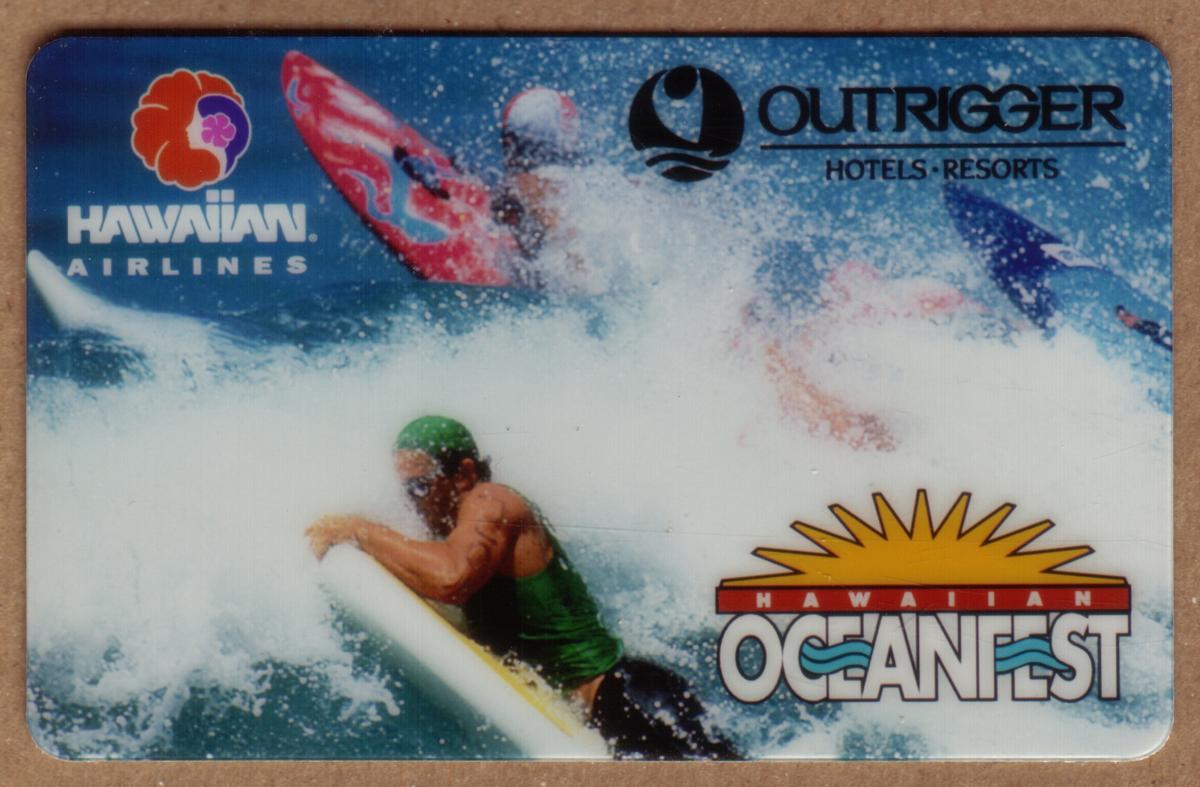 The card visually celebrates the surfing culture of Waikiki, Oahu, and is linked to festivals and events that involve Hawaiian Airlines and Outrigger Hotels, as indicated by the referenced sponsors. The imagery and logos demonstrate a clear connection to Hawaiian OceanFest, held in September 1996.