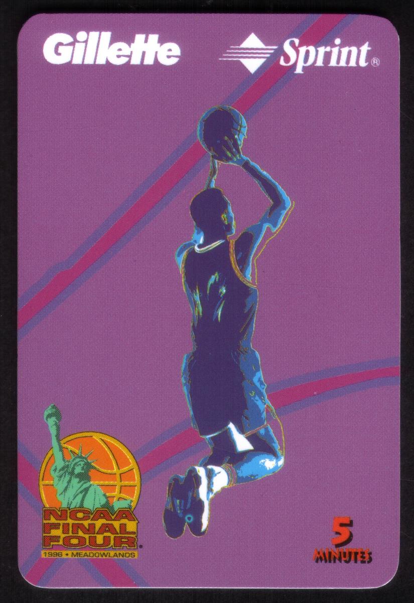 1996 NCAA Final Four basketball themed prepaid phone card featuring a jumping male player, NCAA logo, Final Four emblem, and 5-minute usage indicator. |