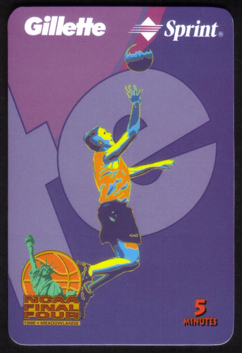 NCAA basketball 1996 Final Four themed phone card featuring a basketball player, Gillette and Sprint logos, Statue of Liberty, and Americana imagery. |