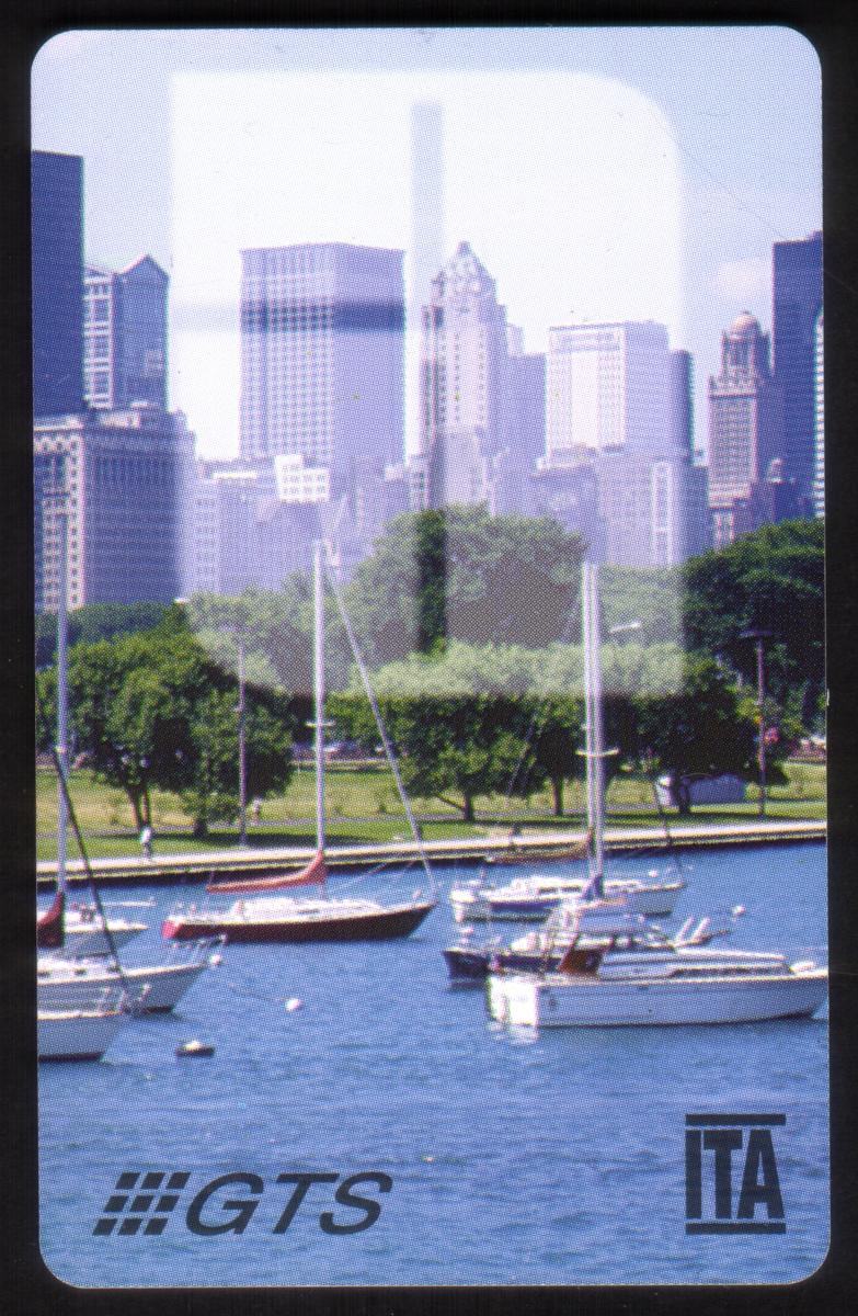 This collectible phone card commemorates the International Telecard Association (ITA) Dinner held in Chicago in April 1997. Featuring a photographic image of Chicago's skyline, the card highlights notable architectural elements along the waterfront, including high-rise buildings and boats docked at the marina. The scene captures a sunny day with clear skies, emphasizing the city’s modern urban landscape and its relation to boating and water activities.