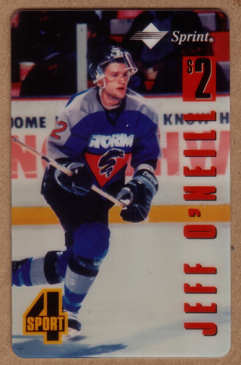 This is an NHL collectible phone card from the 4 Sport series featuring Jeff O'Neill, tying into hockey themes and the Canadian Hockey League (CHL). The card visually captures the fast-paced nature of ice hockey and highlights Jeff O'Neill as a prominent player in the sport.