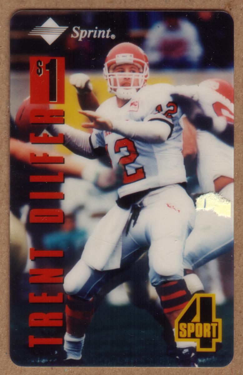 This collectible phone card features an action photograph of Trent Dilfer, a professional football player, shown mid-play in his white football uniform with red and orange accents. Dilfer is captured wearing a white helmet and jersey number 2, preparing to throw the football. His name, "TRENT DILFER," is prominently displayed vertically in bold red letters along the left side of the card. A red box at the top left corner displays the card's value of $1.